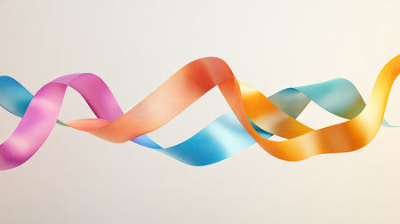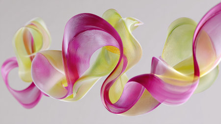 Soft and elegant ribbons in pink, blue, and yellow gracefully undulate across a light background, showing vibrant colors and delicate shapes.