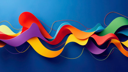 Colorful flowing ribbons create a vibrant abstract design against a soft blue backdrop