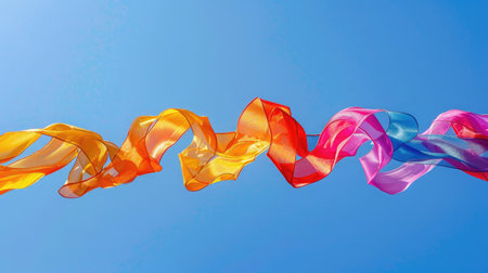 Dynamic composition featuring vibrant, flowing ribbons in multiple colors against a bright, clear blue backdrop. The image showcases textures, light reflections, and a sense of movement suggesting an airy or atmospheric setting. Suitable for use in design projects, advertising, and other creative purposes that require a modern or artistic aesthetic.