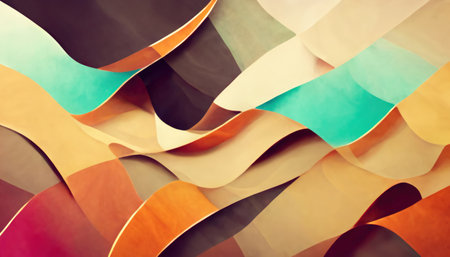 Color block abstract background. curl layers. Orange cyan blue pink curve shape mosaic pattern contemporary ornament art illustration.
