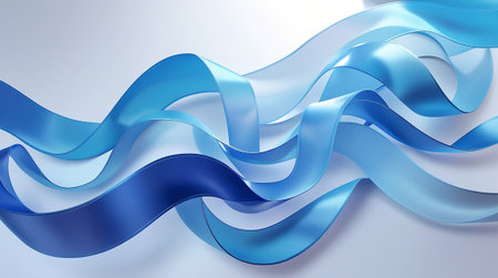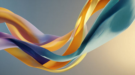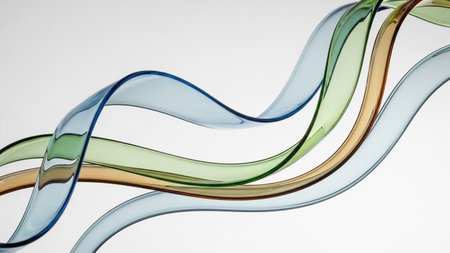 Translucent wavy ribbons of blue green and amber flowing gracefully across a clean white background creating a...