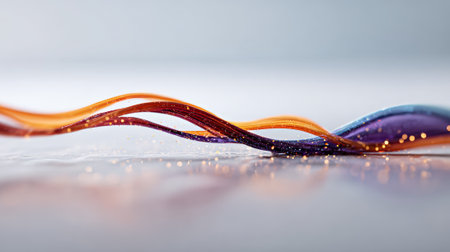 Flowing abstract ribbon waves displaying a blend of purple, orange, and blue hues, creating a dynamic visual with sparkling glitter particles scattered across a light reflective surface