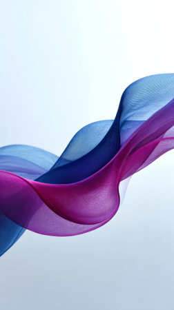 Fluid blue and magenta fabrics flowing gracefully through the air, creating a dynamic abstract background with smooth curves and light transparent textures