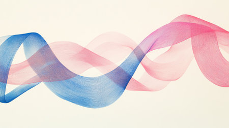 Delicate pencil strokes intertwine in smooth, flowing ribbons displaying a harmonious gradient from soft blue to gentle pink, creating a serene and artistic effect.