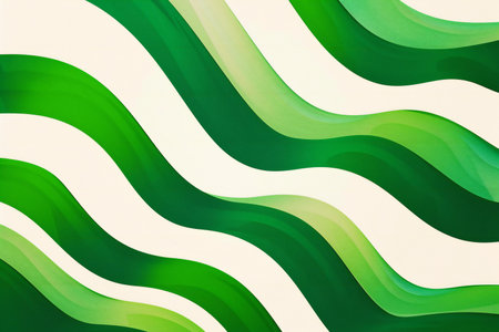 Abstract wavy stripes in shades of green, blue, and gray with thin white edges create a layered visual.