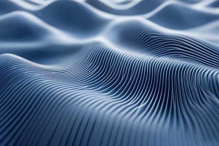 This artistic rendering displays an abstract landscape of undulating, wave-like forms, primarily in rich shades of blue. The scene is characterized by rhythmic peaks and valleys that create a strong sense of dynamic movement and flow. Fine, textured details enhance the depth and suggest a layered or granular construction, contributing to the visual interest of the blue gradient transitions. This versatile backdrop evokes deep ocean currents, topographical patterns, or advanced digital data visualizations. It provides a modern, serene, yet powerfully aesthetic foundation for many creative projects.