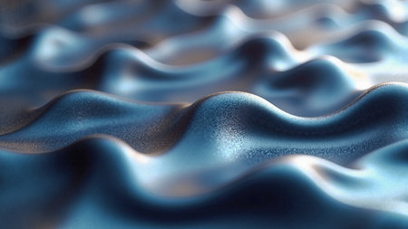 Abstract nanotechnology pattern of flowing blue waves with light shimmering across the surface, showing fine detail and structure..