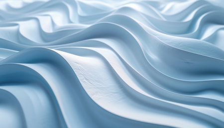 Smooth, wavy abstract forms in shades of white and light blue create a serene, organic texture with gentle curves...