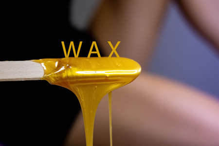 sugar paste or wax honey for hair removing flows down from waxing spatula stick. beauty spa concept. sugaring depilation.