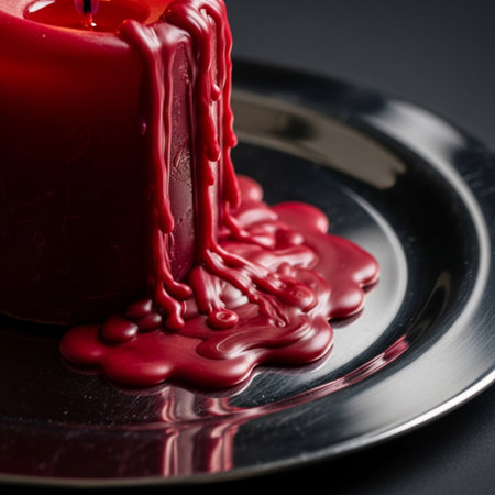 Red wax candle on a black plate, close-up, macro