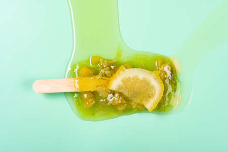 melted watermelon and pineapple flavor ice pop with slice of kiwi fruit on a light green background