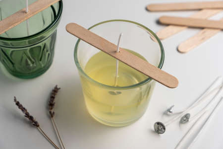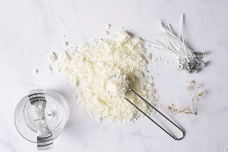 Set for crafting candle. Eco soy wax on white table. DIY candle. Hobby concept