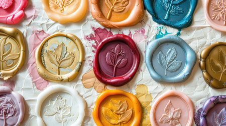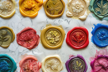 Collection of colorful wax seal stamps with different embossing, showcased on antique paper