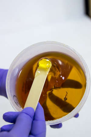 Beauticians hand with glove holding wooden spatula with depilation wax