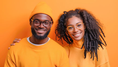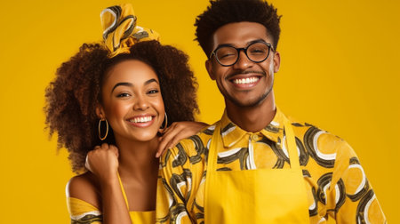 Beautiful young African couple gesturing and smiling while standing against yellow background : Generative AI
