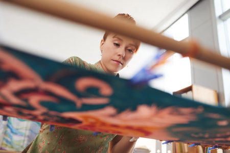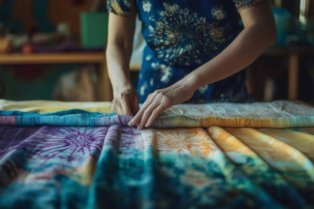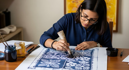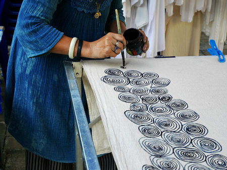 Thai woman people artist painting pattern with natural color indigo on fabric shawl scarf on table in workshop studio at house in Nonthaburi, Thailand