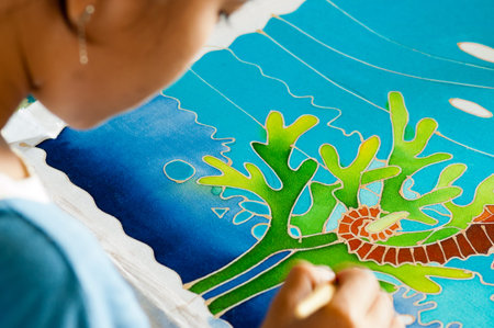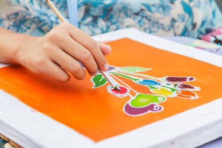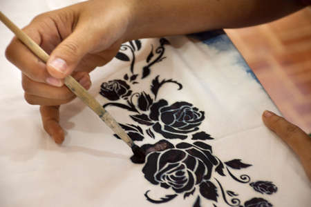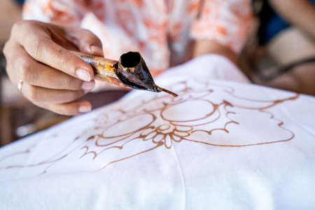 Closeup Hand with special wax tool brush canting pen Painting Batik on Malaysian batik Fabric.