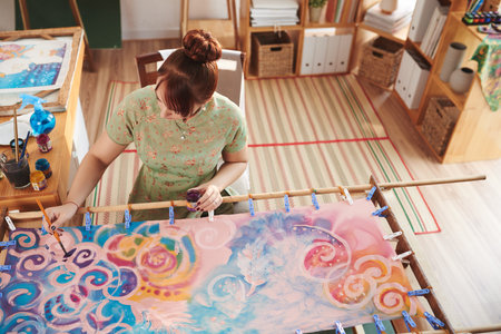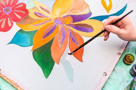 painter draws floral pattern on white silk canvas on wooden frame in cold contour batik technique