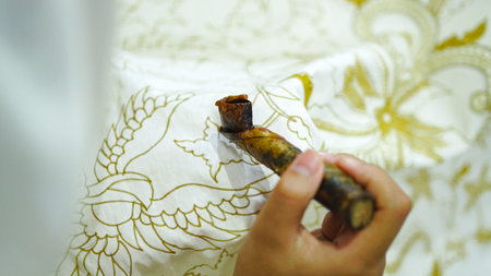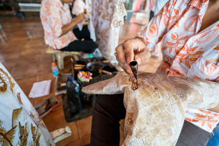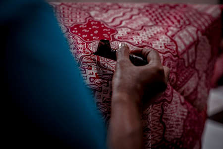August 11 2019, Surakarta Indonesia : Close Up hand to make batik on the fabric with canting with bokeh background