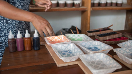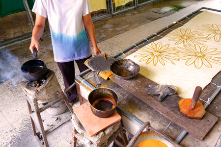 Traditional batik making process with melted wax and fabric design, showing artisan tools and flower patterns in a handmade textile workshop.