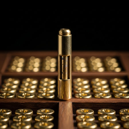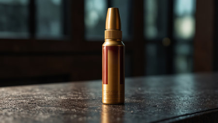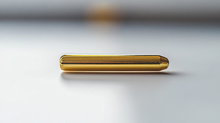 This close-up image captures a shiny golden cylindrical object with smooth surface details, reflecting light against a soft gradient background. Ideal for luxury themes.