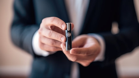 Close-up of a man in a suit holding an electronic cigarette