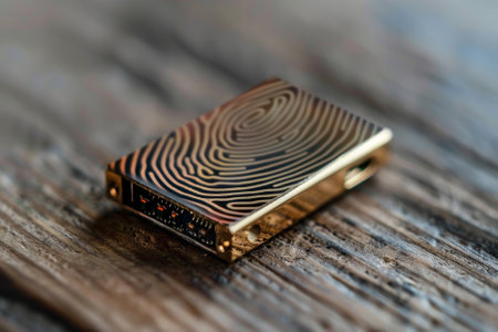 A small, gold colored device with a fingerprint design on it. The device is sitting on a wooden surface