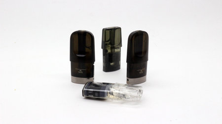 Replacement cartridge for vape pod or new vape pen device with liquid contained salt nicotine, macro photo.