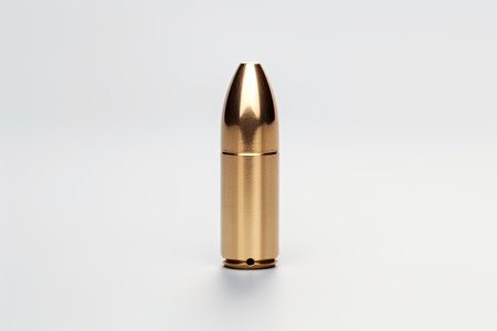 9mm bullet photographed up close on a plain white surface