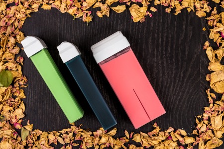Picture of liposoluble wax cartridges for waxing on black backgroung