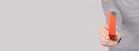 Hand with red flame lighter on grey.