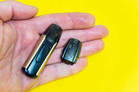 Vape pod in male hand or pod mod with changeable cartridges close up - newest generation of vaping products.