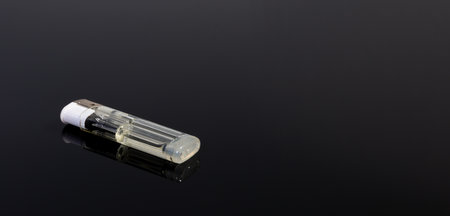 A panoramic shot of white gas lighter on a black reflecting background