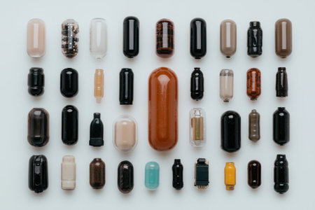 Collection of various capsule-shaped objects arranged on a white background