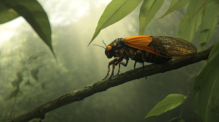 This image captures a stunning cicada resting on a branch in a sun-drenched forest. Lush greenery surrounds the insect, highlighting nature's beauty.