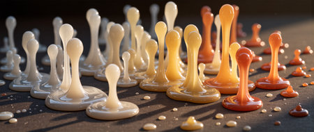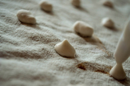 White yellow caramel mass for preparation of lollipops spread on pastry table. Cooking sweet candy. Handmade sweets. Background of sweet food, candies for holiday, childrens birthday. Extra close up.