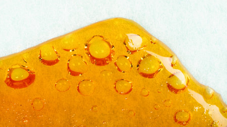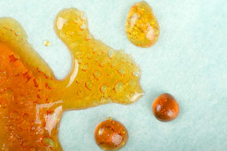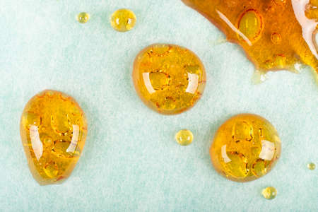 pure clear marijuana wax on yellow background, cannabis dab texture.