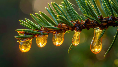 Resin glistens as it flows down a tree trunk, illuminated by the soft light of the setting sun.