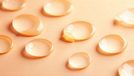Drops of transparent cosmetic gel or serum yellow on a beige background. The concept of cosmetics or virus protection. top view.