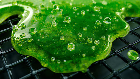 Glycerin gel texture. Transparent serum drops on green background. Liquid gel moisturizer with bubbles macro. pattern.