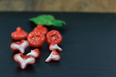Rose apple or jambu on dark background under sunlight. Thailand apple tropical fruit flavors of sweet red gloss.