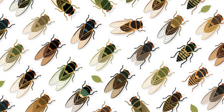 A repeating pattern of various cicada insects in different colors and patterns, including green, brown, and black, with transparent wings and orange eyes on a white background.