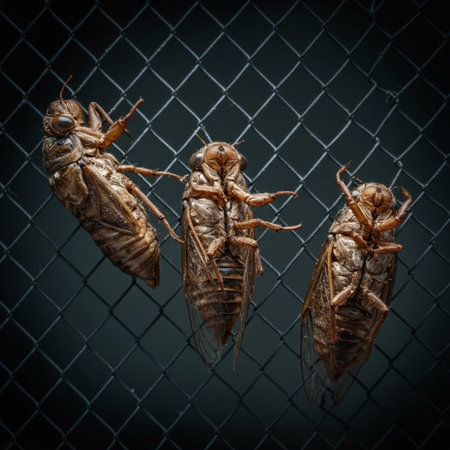 Macro shot of cicada shedding exoskeleton revealing delicate wings and glossy eyes
