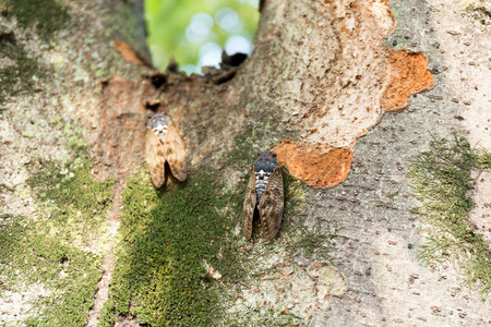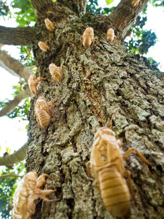 Cicada stick resting on a tree in Thailand's park, displaying its amazing musical talents and enjoying a tropical climate.
