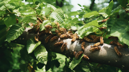 Explore the captivating world of insects with this close-up photo showcasing colorful critters on textured bark, surrounded by lush greenery, highlighting nature's beauty.