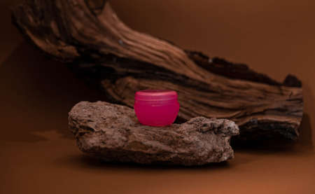 The cream pink bottle stands on a light stone with a background of wood. Natural concept. Сream pink bottle on a natural background.