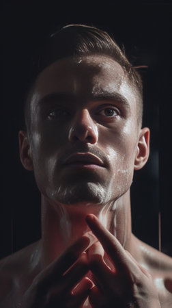 In a dark room, a man stands with eyes closed as a single beam of light shines on his face. This moment captures a profound sense of hope amidst the surrounding darkness, emphasizing resilience.