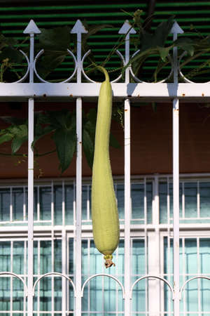 Sponge Gourd green On the fence, Sponge Vegetable Spong (Luffa cylindrica), Freshness Sponge Gourd, Luffa gourd plant, luffa or dishcloth gourd with varieties Passion Fruit.