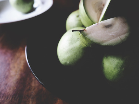 Fresh calabash in a wooden bowl and green bowl on dark background