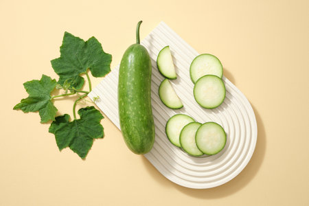 Top view of fresh winter melon slices and leaf displayed on beige arch podium on a beige background. Advertising scene for a product with winter melon ingredients with many great health benefits